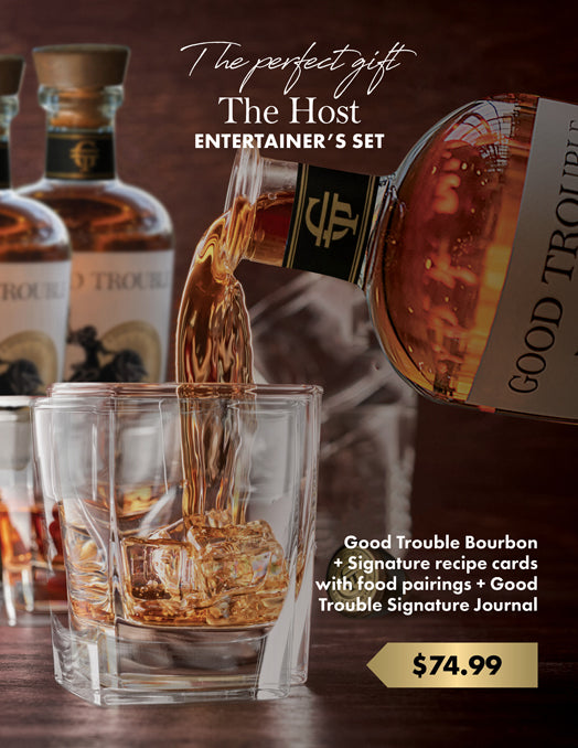 Good Trouble Bourbon + Signature recipe cards with food pairings + Good Trouble Signature Journal.